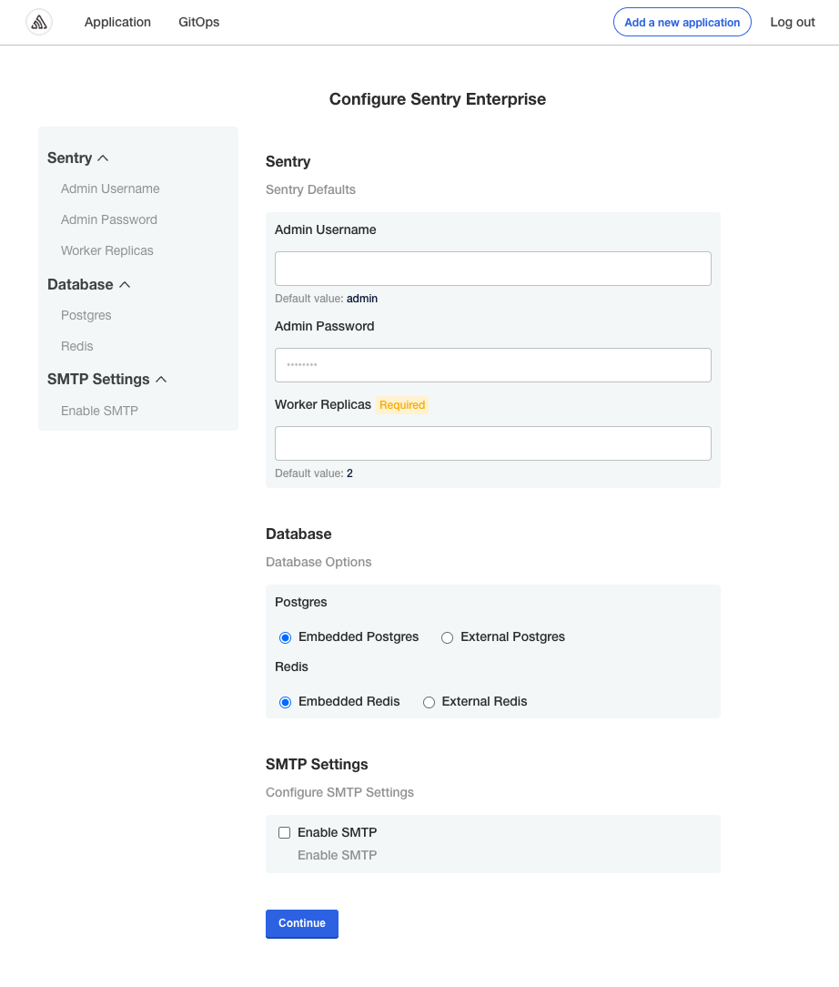 Or, you can also use the configuration screen to provide a database option that runs in the cluster as part of your application. For an example of this use case, see Example: Adding Database Configuration Options.