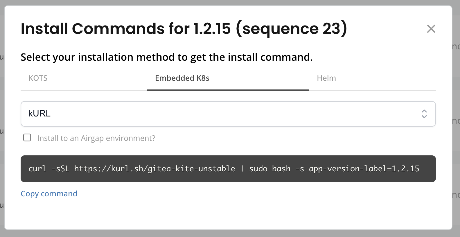 For information about getting installation commands with the Replicated CLI, see channel inspect. For information about getting installation commands with the Vendor API v3, see Get install commands for a specific channel release in the Vendor API v3 documentation.